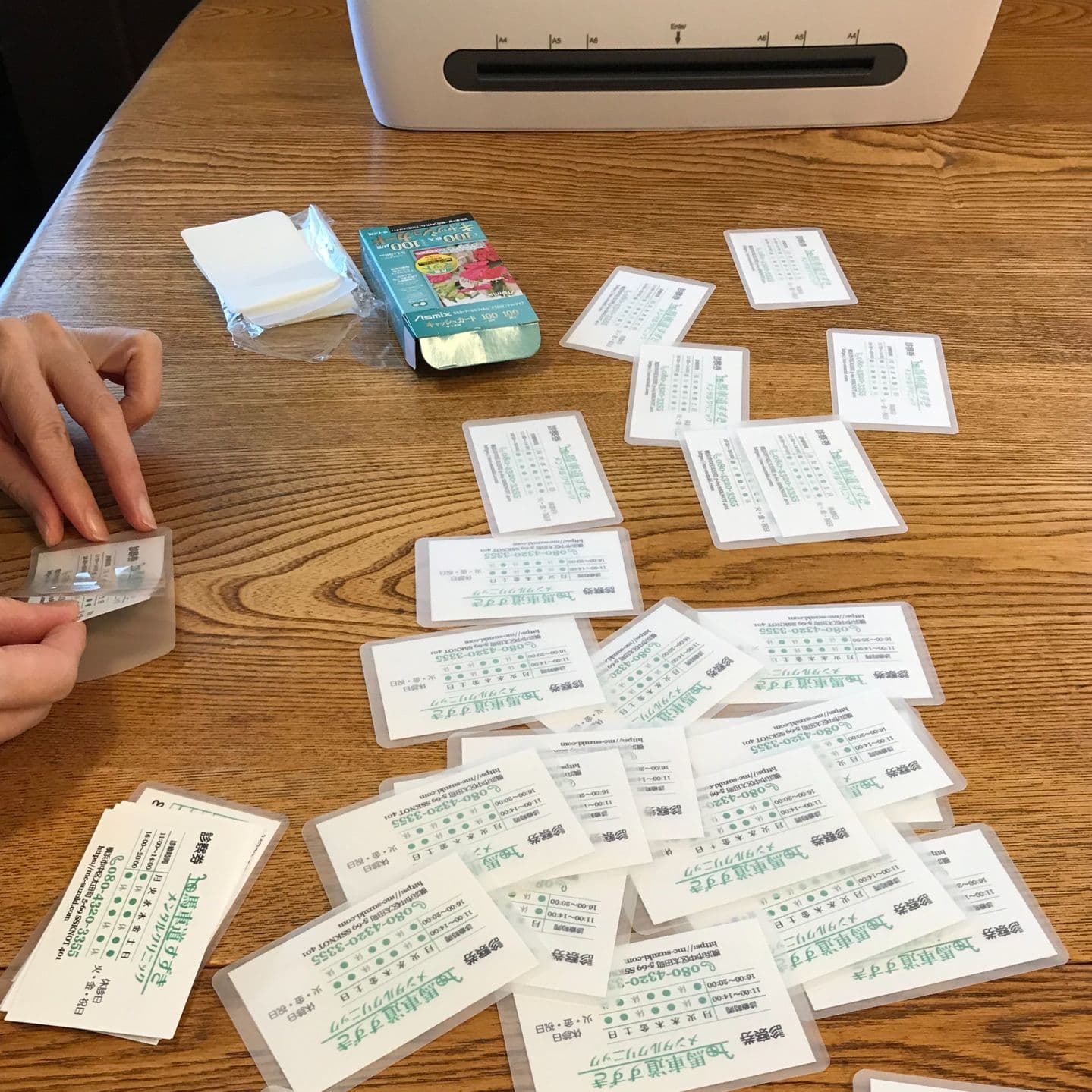 金輪際するまいと決意してしまった手前、恥ずかしながら、保険診療内でできるぎりぎりの運営をしておりまして、何から何まで家内手作業にならざるをえず、診察券も完全に手製です。パソコンでデザイン、印刷して、パウチしています。それで、診察券、曲がってしまっています。