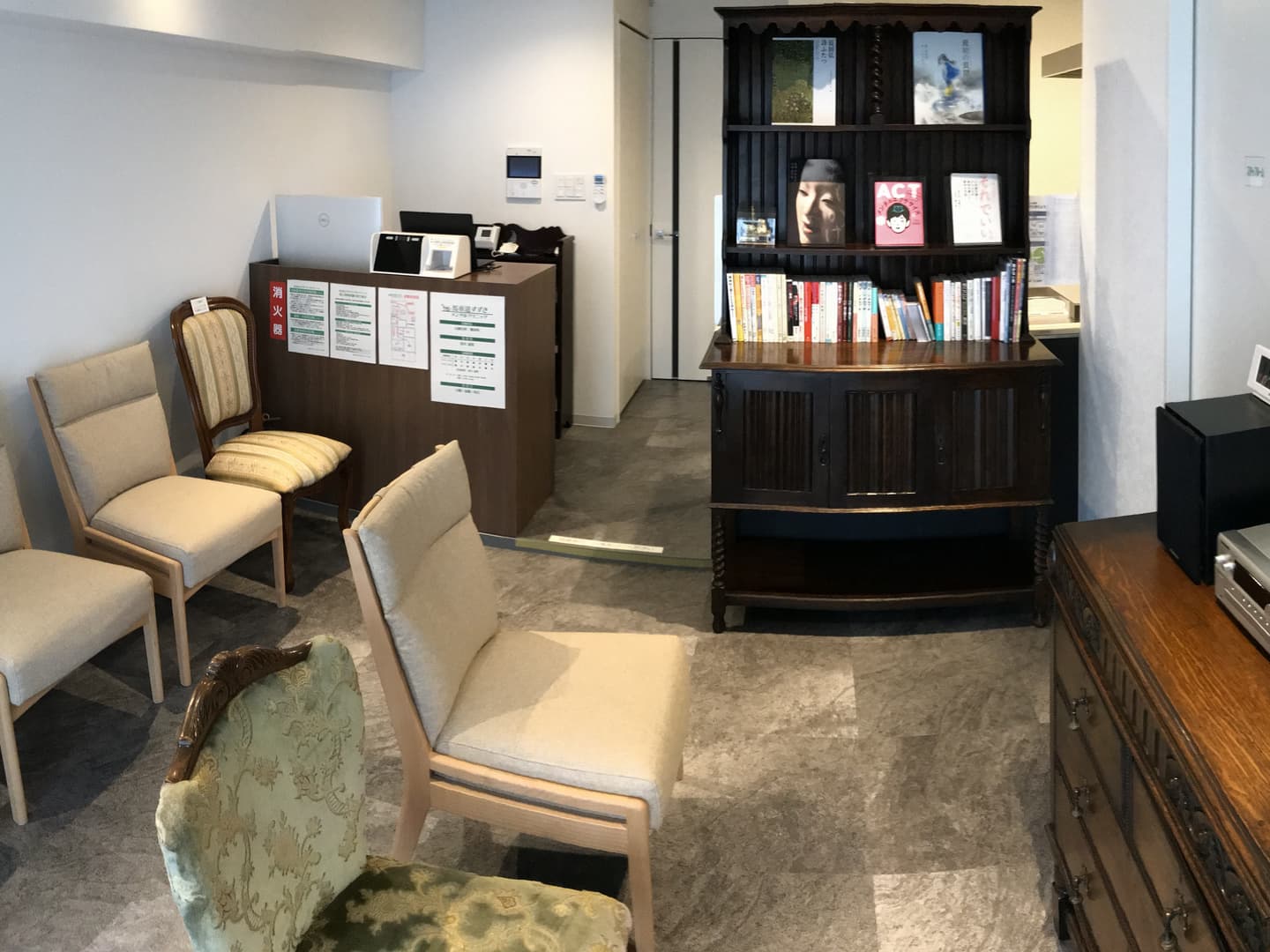 受付台を置いて、少しはクリニックらしくなったでしょうか。でも、やっぱり居間なんですよね―ー。