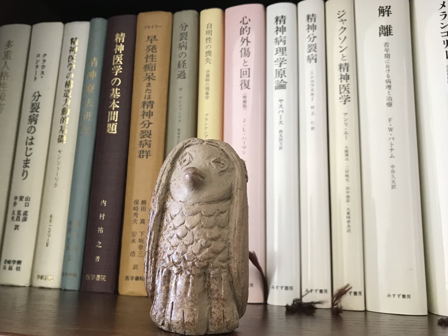 アマビエの背景には、精神病理学の図書の一部が写っています。精神科医療に携わる者として、どれも必読書です。何度も読み返しては、自らの至らなさに気づかされるのですが、畢竟、中途半端な自省しかできないと、都度に思い知らされるばかりです――。それでも、こうした古今の大家の言説に、日々、どれだけ助けられていることでしょう。